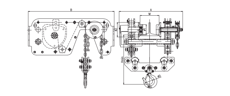 低凈空手拉葫蘆通過特定的設計能使重物上升至離固定處最近,實現(xiàn)單軌小車及手拉葫蘆的超低空組合,特別適用于受空間限制的設備安裝及維修場合。